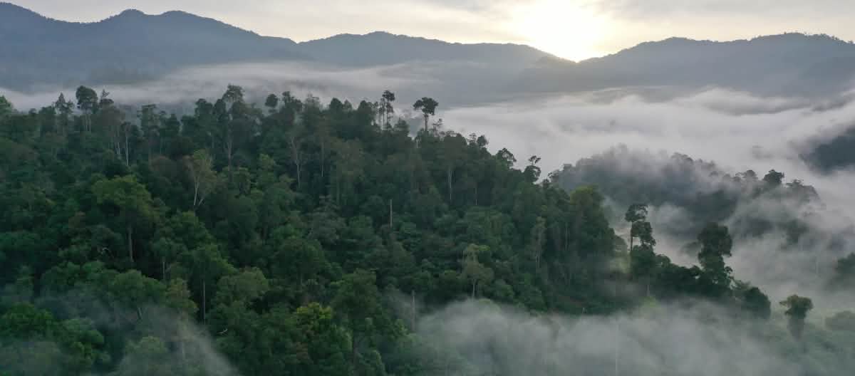 Awan di atas pegunungan berhutan